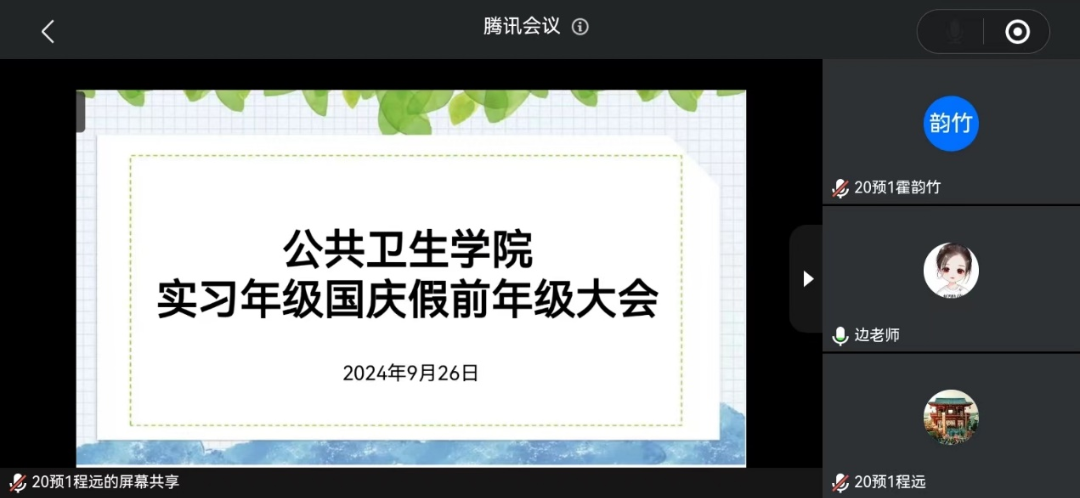 实习年级假前安全教育年级大会由边晓飞老师主讲。会议重点明确了假期安全、疾病预防、实习纪律、寝室安全等问题。第一,假期安全。从假期出行交通安全、人身安全、财产安全、食品安全、防溺水教育、防毒品教育、防不法侵害教育等方面,全方位、多层次地强调了提高安全防范意识的重要性,叮嘱同学们增强自我保护意识。第二,疾病预防。提醒同学们尤其注意秋冬换季期间呼吸道、肠道疾病的传播,并加强艾滋病、猴痘等传染病的个人防护意识。第三,实习纪律。提醒同学们要遵守实习单位的放假时间及相关要求,履行正规请假流程后告知实习单位相关负责人员,并及时在辅导猫上提交请假申请,通过审批后方可开始休假。在日常实习过程中要按时到岗,不得无故擅自离岗。第四,晚就寝打卡。假期中留在实习地的同学,亦要严守晚就寝打卡规则,不得松懈,严禁出现代签、改签等违纪行为发生,共同营造良好实习氛围,并注意寝室用电安全,严禁在寝室使用违章电器。此外,边晓飞老师还提醒大家谨防电信诈骗,保护好个人财产。至此,本次大会圆满结束。