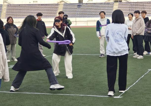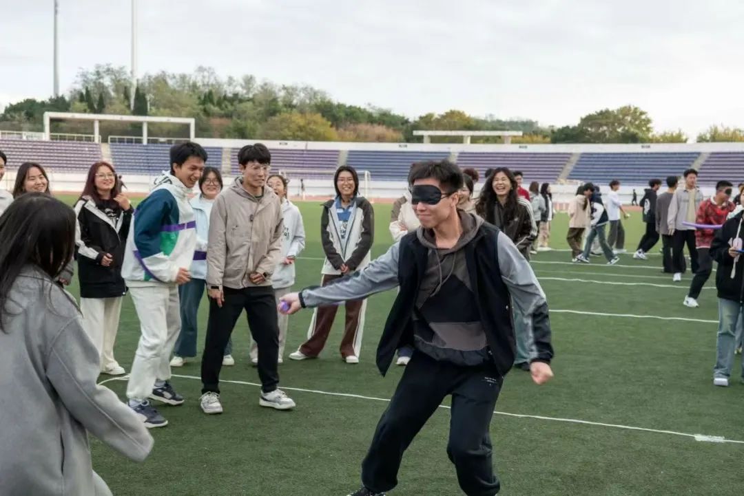 第三个游戏“蒙眼对对碰”,同学们经过抽签进行分组,被选出的代表戴上眼罩,手拿泡沫棒,在队友的指挥下“攻击”对方队员。当视觉被剥夺,我愿意信任你。两队队员在你“追”我“赶”过程中,在欢声笑语中体现了公卫学子互助友爱,团结向上的良好精神风貌。
