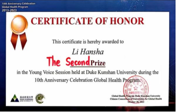2023 年 10 月 27 日至 28 日,中国全球健康大学联盟(CCUGH)与昆山杜克大学(DKU)合作承办“昆山杜克全球健康项目十年庆典”活动,Beat365官网作为中国全球健康大学联盟成员应邀参加研讨会,丁玎副教授指导的研究生参加了其中的青年学者竞赛并取得良好成绩。